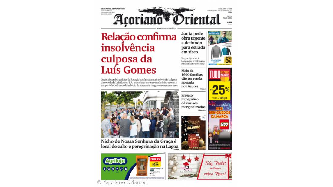 A manchete do Açoriano Oriental destaca que os juízes desembargadores da Relação confirmaram a insolvência culposa da sociedade Luís Gomes, S.A. e condenaram os seus administradores a um período de 6 anos de inibição de ocuparem cargos em empresas.