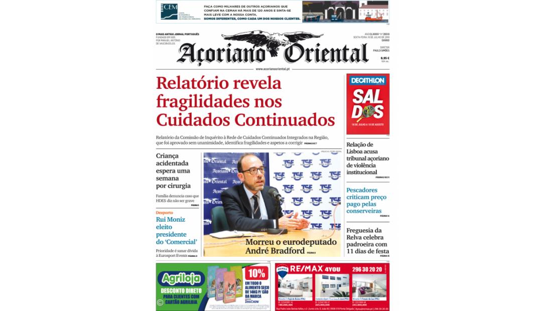 A fotografia desta Primeira Página é do eurodeputado André Bradford que morreu ontem.