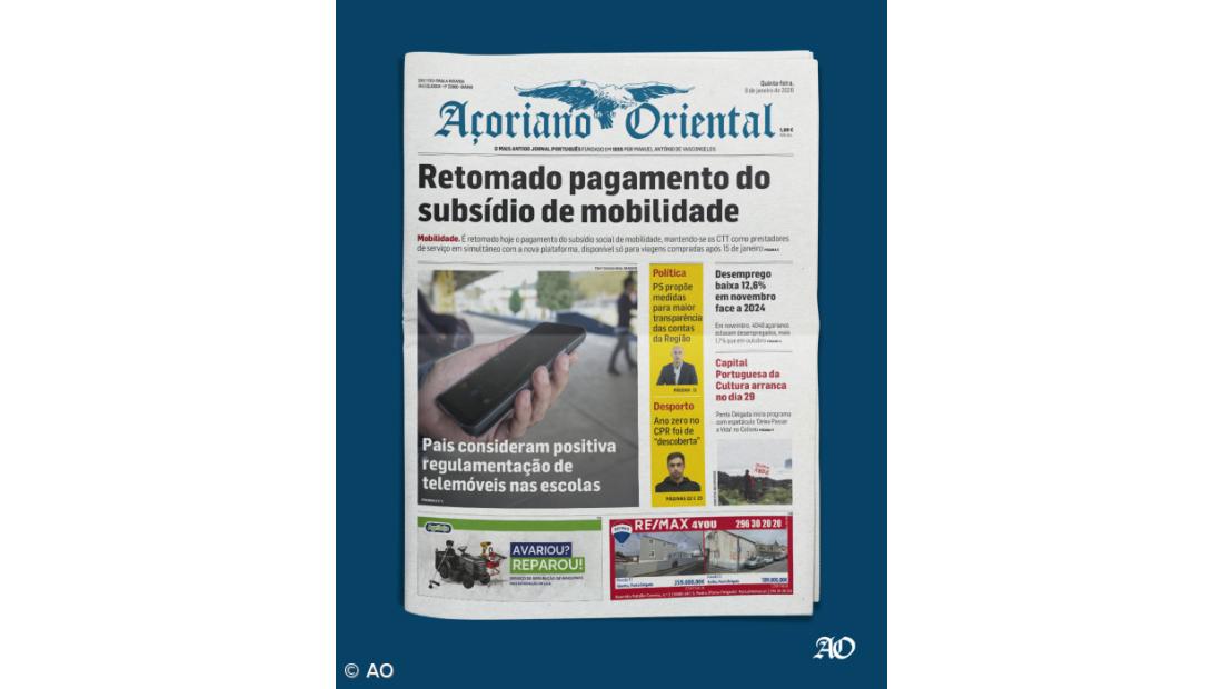 Pagamento do subsídio de mobilidade vai ser retomado, mantendo-se os CTT a fazer o reembolso em simultâneo com a plataforma até 30 de junho. O assunto está em destaque no Açoriano Oriental de quinta-feira, 8 de janeiro de 2026.