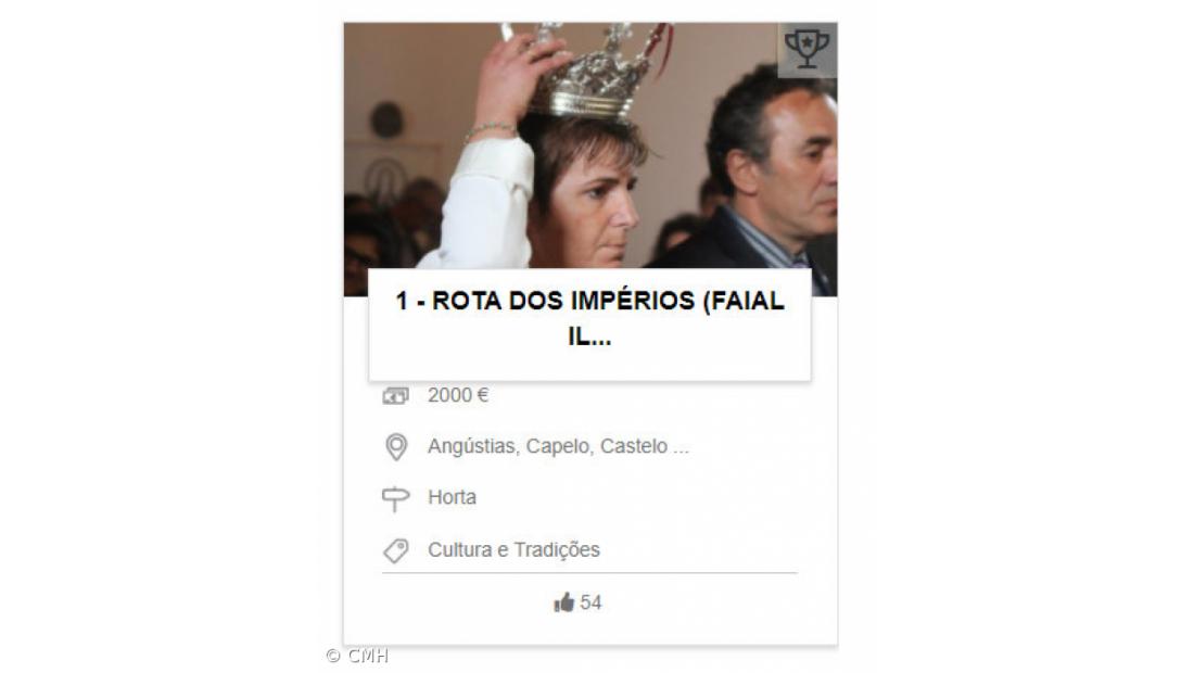 Segundo nota, o projeto vencedor enquadra-se na categoria 'Cultura e Tradições' e, de acordo com a descrição do seu proponente, consiste na criação de uma “Rota pelos Impérios da ilha do Faial, dando a conhecer as festividades do Divino Espírito Santo, bem como as suas tradições, gastronomia, histórias e respetivas lendas”.