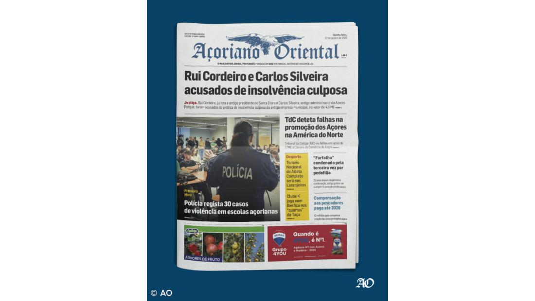 O antigo presidente do Santa Clara, Rui Cordeiro e o antigo administrador da Azores Parque, Carlos Silveira, foram acusados de insolvência culposa da ex-empresa municipal, no valor de 4,3 milhões de euros. O assunto está em destaque no Açoriano Oriental de quinta-feira, 22 de janeiro de 2026.