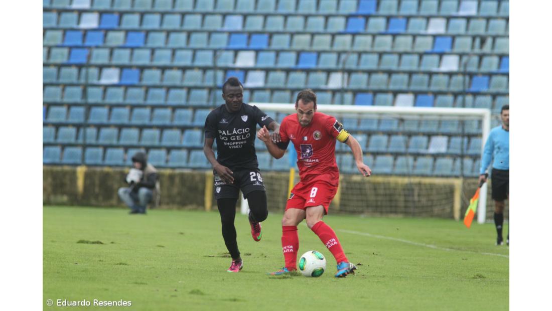 Grande jogada de Minhoca à entrada da área, a servir na meia direita Hugo Santos que rematou com a parte de fora da bota e a bola a bater nas malhas laterais da baliza viseense