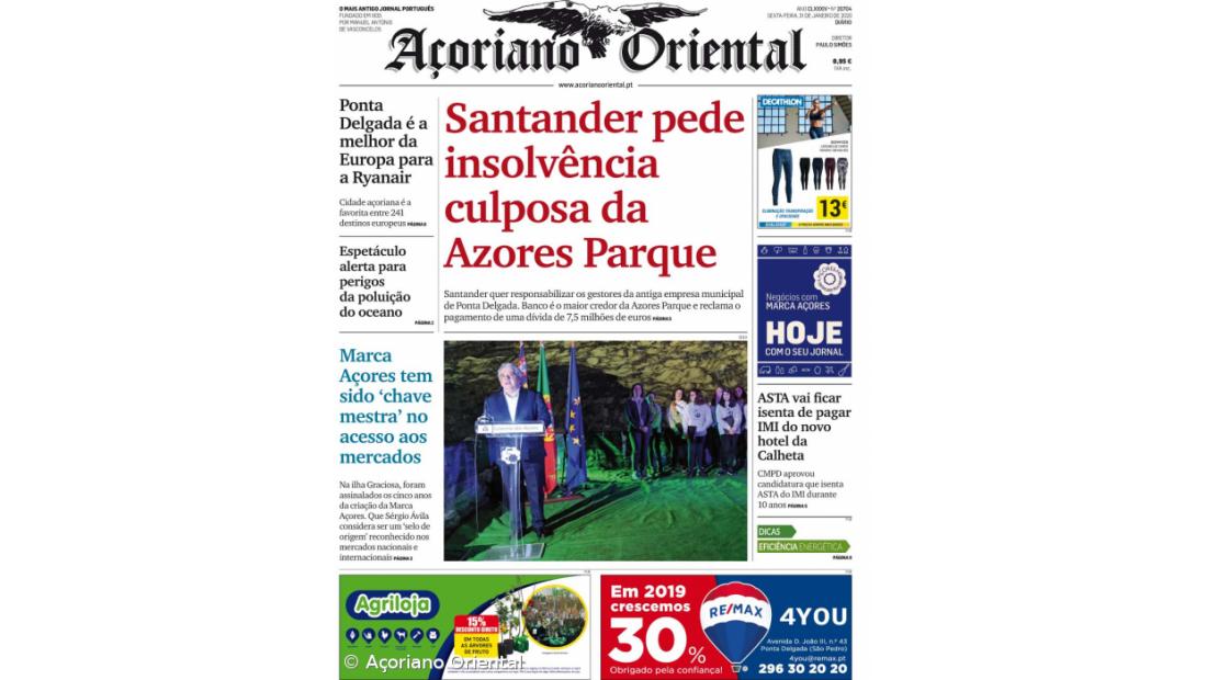 "Santander pede insolvência culposa da Azores Parque" é a manchete do Açoriano Oriental