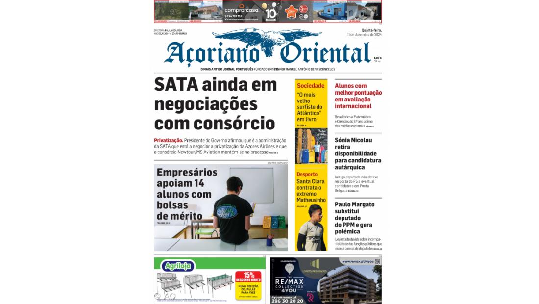 As declarações do presidente do Governo Regional, José Manuel Bolieiro, a anunciar que a SATA está a negociar com o consórcio Newtour/MS Aviation, apesar do concurso de privatização ter sido cancelado em maio, estão em destaque no Açoriano Oriental de quarta-feira, 11 de dezembro de 2024.