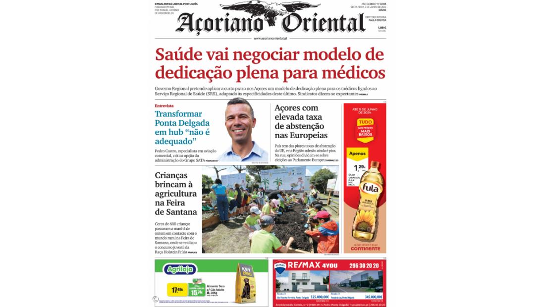 A primeira página de hoje também destaca uma entrevista a Pedro Castro, especialista em aviação comercial, que afirma que "Transformar Ponta Delgada em hub 'não é adequado'".