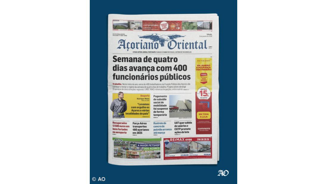O arranque do projeto-piloto da semana de quatro dias na Função Pública dos Açores está em destaque no Açoriano Oriental de sábado, 3 de janeiro de 2026.
