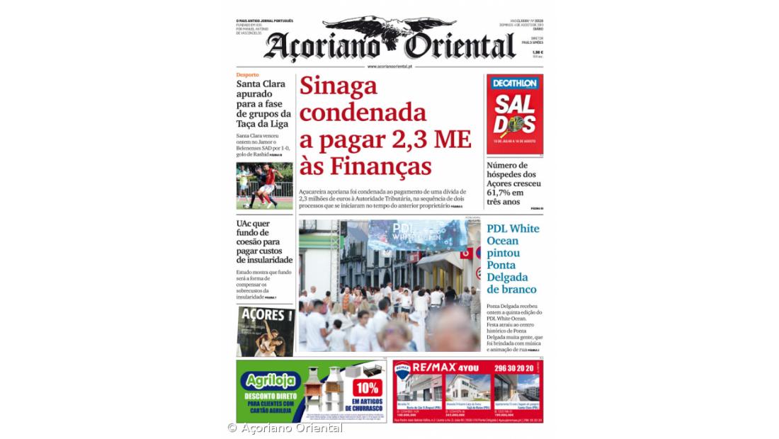 A manchete do Açoriano Oriental destaca que a Sinaga foi condenada ao pagamento de uma dívida de 2,3 milhões de euros à Autoridade Tributária, na sequência de dois processos que se iniciaram no tempo do anterior proprietário.