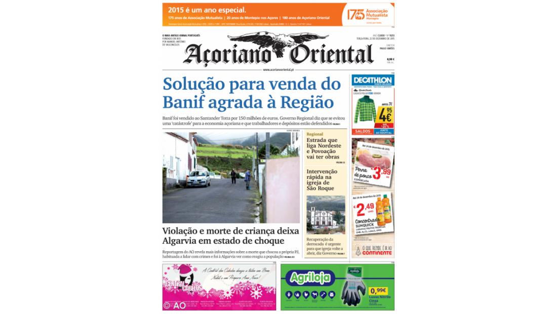 O processo da venda do Banif ao Santander Totta e a reação do Governo Regional dos Açores a esta venda estão em destaque no Açoriano Oriental de terça-feira, 22 de dezembro de 2015.
