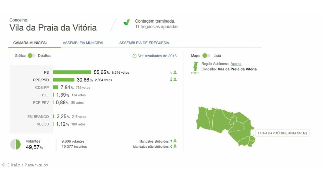 O candidato do PS Tibério Dinis foi hoje eleito presidente da Câmara Municipal da Praia da Vitória, de acordo com dados do Ministério da Administração Interna.