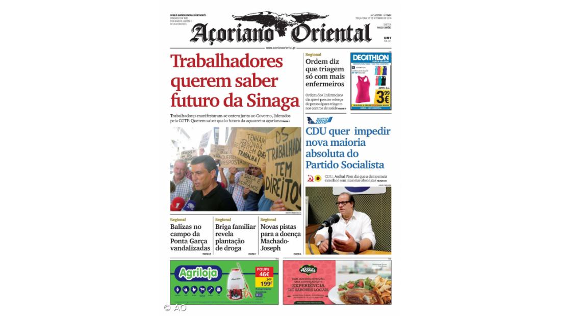 "Trabalhadores querem saber futuro da Sinaga" é a manchete do Açoriano Oriental