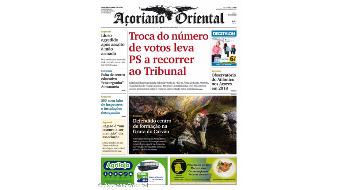 A manchete do Açoriano Oriental destaca que o PS apresentou recurso no Tribunal Constitucional por causa da troca do número de votos na Junta de Freguesia de Santo António, no concelho de Ponta Delgada.