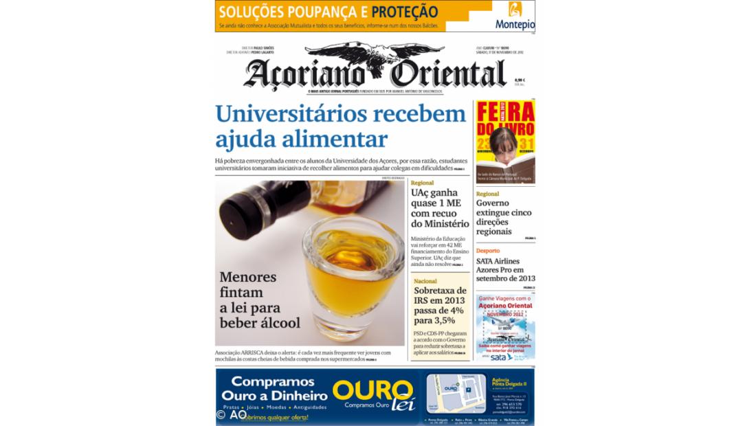 "Menores fintam a lei para beber álcool", "Sobretaxa de IRS em 2013 passa de 4% para 3,5%" e "SATA Airlines Azores Pro em setembro de 2013" são as restantes chamadas da primeira página da edição deste sábado.