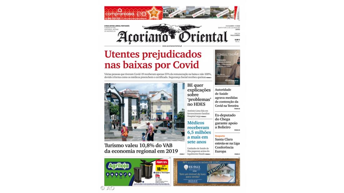 "BE quer explicações sobre 'problemas' no HDES" e "Autoridade de Saúde agrava medidas de contenção da Covid na Terceira" são outros destaques do jornal.
