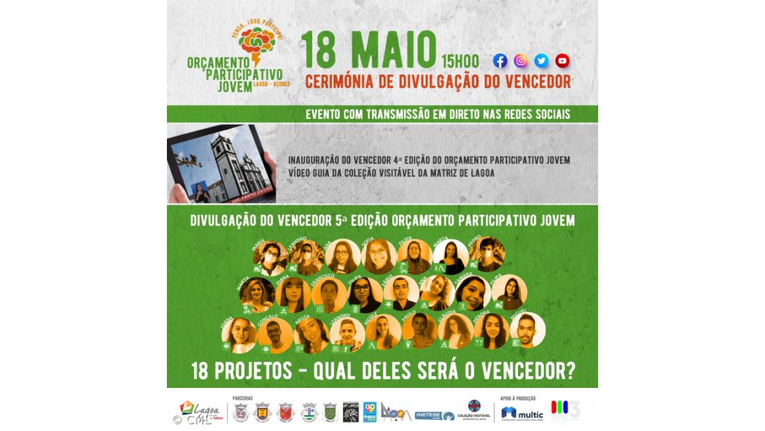 A cerimónia de divulgação do vencedor acontecerá em regime misto, sendo a componente presencial feita a partir do salão nobre do Convento de Santo António, com a presença do presidente da Assembleia Municipal, da presidente da Câmara Municipal de Lagoa, acompanhada de membros do executivo camarário, representantes das juntas de freguesia e dos estabelecimentos de ensino que, através de videochamada, ligar-se-ão aos jovens proponentes dos 18 projetos finalistas, dando a conhecer o vencedor da edição deste ano.