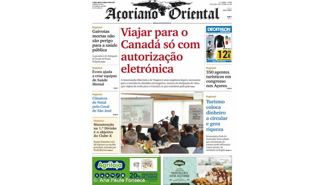 Viajar para o Canadá só com autorização eletrónica, é a manchete do Açoriano Oriental. A Autorização Eletrónica de Viagem é uma exigência legal e necessária para a entrada de cidadãos estrangeiros, isentos da obrigação de visto, que viajem de avião para o Canadá ou que transitem pelo país