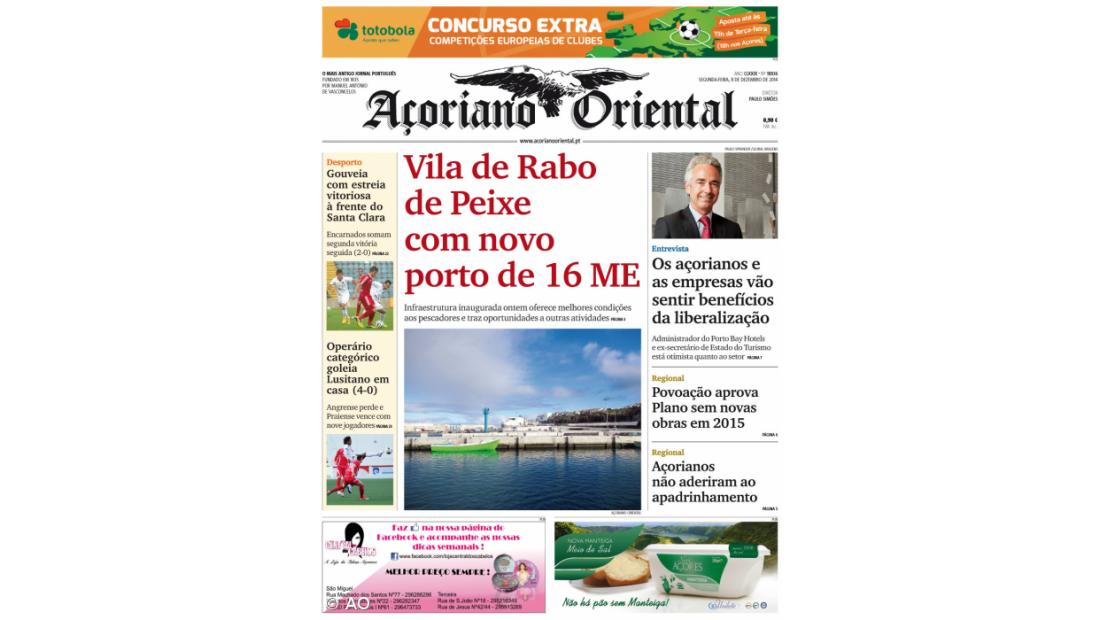 Na primeira página, são feitas ainda chamadas para a entrevista a Bernardo Trindade, administrador do Porto Bay Hotels e ex-secretário de Estado do Turismo, para a aprovação do Plano da Câmara da Povoação para 2015 sem novas obras e para a pouca adesão ao Apadrinhamento Civil.