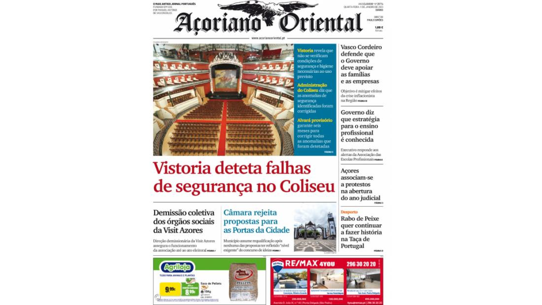 "Vistoria deteta falhas de segurança no Coliseu" é a manchete da edição desta quarta-feira do Açoriano Oriental.